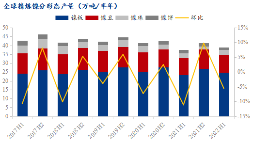 2022上半年,經(jīng)歷地緣局勢沖突、鎳價巨幅波動、疫情持續(xù)、以及多家工廠設(shè)備檢修等事件,全球精煉鎳供應(yīng)環(huán)比去年下半年有所減少,同比有小幅增漲。
