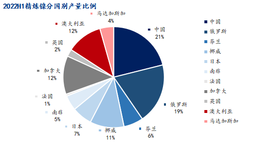 中國進口了大量低價中間品原料,精煉鎳生產(chǎn)有了較大提升,繼續(xù)占據(jù)世界精煉鎳第 一生產(chǎn)國的位置。俄羅斯修復(fù)了滲水的礦場,生產(chǎn)得到恢復(fù),但由于國際局勢的動蕩,銷售和物流都遇到阻礙,切實供應(yīng)至市場的量仍然有限。挪威在上半年受到行業(yè)罷工影響,產(chǎn)量出現(xiàn)較大下滑。澳大利亞鎳豆生產(chǎn)因工廠設(shè)備檢修而停產(chǎn),同環(huán)比皆有明顯減少。加拿大的精煉鎳工廠同樣遇到設(shè)備維護問題,產(chǎn)量處于相對低位。法國的精煉鎳工廠所有權(quán)轉(zhuǎn)移,上半年多數(shù)時間處于整合期,產(chǎn)量較少。日本、南非、英國、馬達加斯加等國的精煉鎳生產(chǎn)則較為穩(wěn)定。