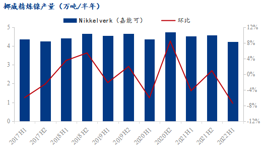 嘉能可在挪威的鎳冶煉廠Nikkelverk是西歐zui大的精煉鎳生產(chǎn)工廠,其原料來自嘉能可在加拿大的鎳礦和第三方供應(yīng),Nikkelverk主要產(chǎn)品為鎳板/鎳角,亦有鎳珠、鎳餅等。上半年工廠生產(chǎn)精煉鎳4.24萬噸,環(huán)比減少7.42%,同比減少6.61%。