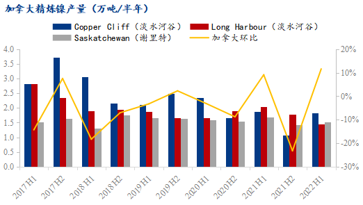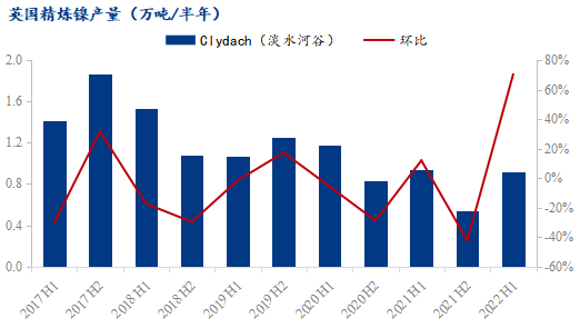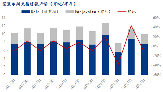 2021年一季度,諾里爾斯克鎳業(yè)位于北極區(qū)域的Oktyabrsky 和Taimyrsky兩座礦山因地下水滲入而暫停運營,維修至5月開始逐漸恢復(fù)生產(chǎn),至11月完全恢復(fù)產(chǎn)能。該兩座礦山提供了諾里爾斯克鎳業(yè)在俄羅斯和芬蘭工廠的約50%礦石原料,其停產(chǎn)對企業(yè)的原料供給影響巨大,2021全年產(chǎn)量較2020年下降了18.12%。故在產(chǎn)能得到恢復(fù)后,2022上半年產(chǎn)量同比有了較大增漲。
