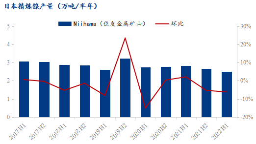 住友金屬礦山株式會社在日本新居濱(Niihama)的工廠2022上半年生產(chǎn)2.51萬噸鎳板,環(huán)比減少6.16%,同比減少11.13%。上半年主要由于原料供應(yīng)問題與設(shè)備檢修,Niihama工廠產(chǎn)量有所減少。