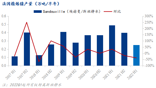 Sandouville工廠年產(chǎn)能1萬噸鎳,主要產(chǎn)品為鎳板,中國市場通稱為“法興鎳”,2022年上半年并無法興鎳進口到國內(nèi),2021年進口量為0.07萬噸。