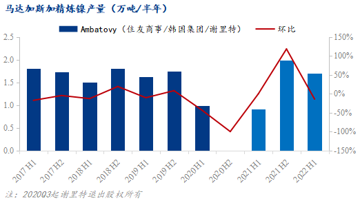 2022上半年Ambatovy的鎳豆產(chǎn)量1.71萬噸,環(huán)比減少14.07%,同比增加87.91%,同比大幅的增量主要由于2021年一季度工廠因疫情影響仍處停運當(dāng)中,至二季度方始復(fù)產(chǎn),導(dǎo)致同比前值較低,上半年中國自馬達加斯加進口鎳豆1.01萬噸。