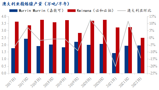 澳大利亞的精煉鎳產(chǎn)能主要來自嘉能可在西澳大利亞的Murrin Murrin工廠和必和必拓公司(BHP)在西澳大利亞的Kwinana工廠,二者的主要產(chǎn)品都為鎳豆和鎳粉。