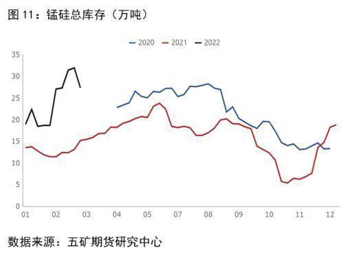 庫存方面,截止3月11日,錳硅總庫存(廠庫+交割庫)27.36萬噸 ,環(huán)比-4.68萬噸,-14.61%;錳硅廠庫13.86萬噸,環(huán)比-4.82萬噸,-25.82%,交割庫13.49萬噸,環(huán)比+0.14萬噸,+1.07%。錳硅庫存水平盡管高于去年同期,但環(huán)比改善明顯。
