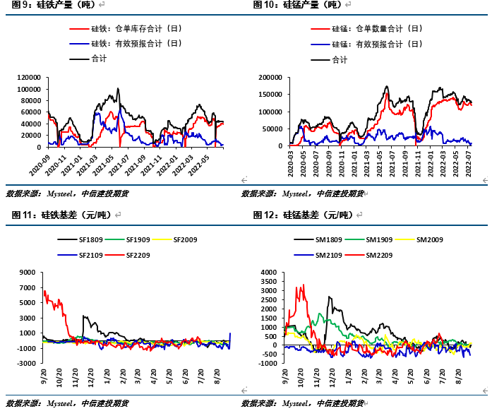 經(jīng)過上周期貨價(jià)格的反彈,盤面跌水基本得到修復(fù),硅鐵09合約基差-200元/噸左右,硅錳09合約基差100元/噸左右?;诨畹慕嵌葋砜?,盤面估值逐漸增加,繼續(xù)上漲的空間并不大。 近期鋼廠主動(dòng)減產(chǎn)的范圍逐漸擴(kuò)大,鐵合金出口情況不佳,需求已經(jīng)實(shí)質(zhì)性下滑。雖然鐵合金生產(chǎn)企業(yè)已經(jīng)減產(chǎn)應(yīng)對,并且減產(chǎn)力度不低,供需基本面存在逆轉(zhuǎn)的條件。但是交割庫存仍然龐大,價(jià)格真正迎來明顯改善,還需庫存進(jìn)一步消化。此外,盤面貼水得到修復(fù),繼續(xù)反彈空間已經(jīng)不大。 |
