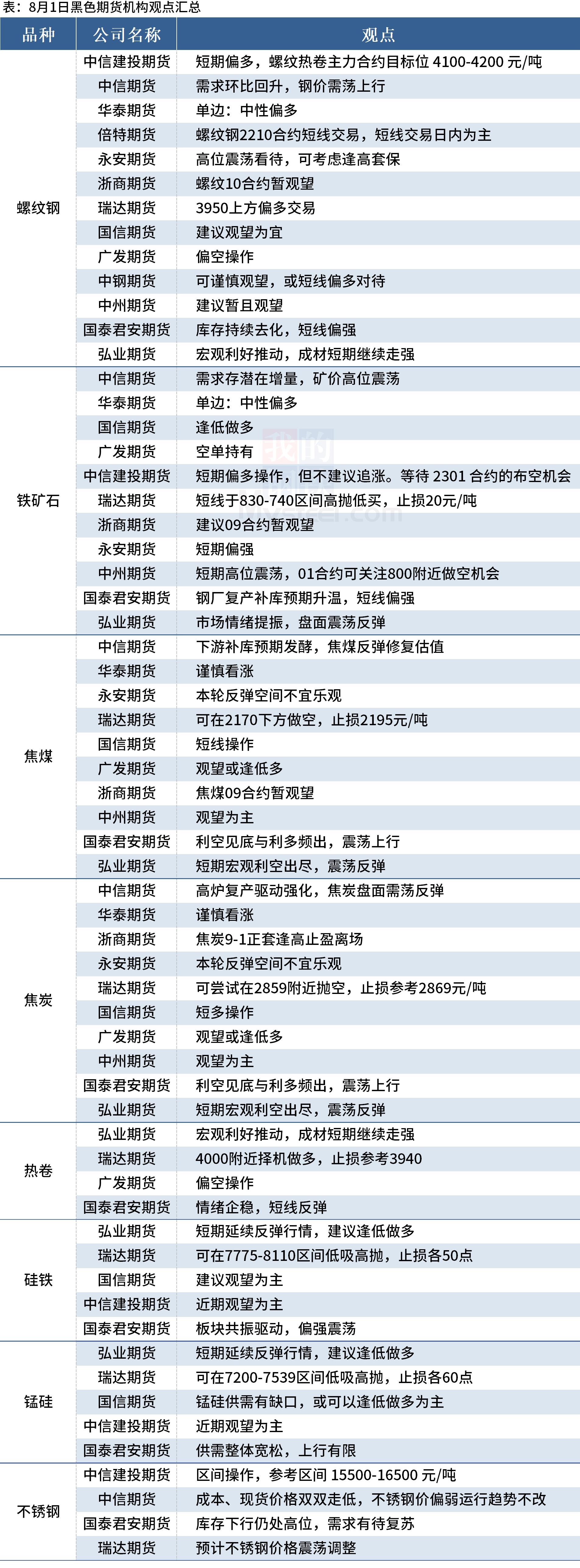 據(jù)Mysteel統(tǒng)計(jì)8月1日13家期貨機(jī)構(gòu)操作策略,其中多數(shù)機(jī)構(gòu)建議螺紋鋼震蕩偏強(qiáng),鐵礦石震蕩偏強(qiáng),預(yù)計(jì)焦煤、焦炭暫觀望。具體匯總內(nèi)容如下: