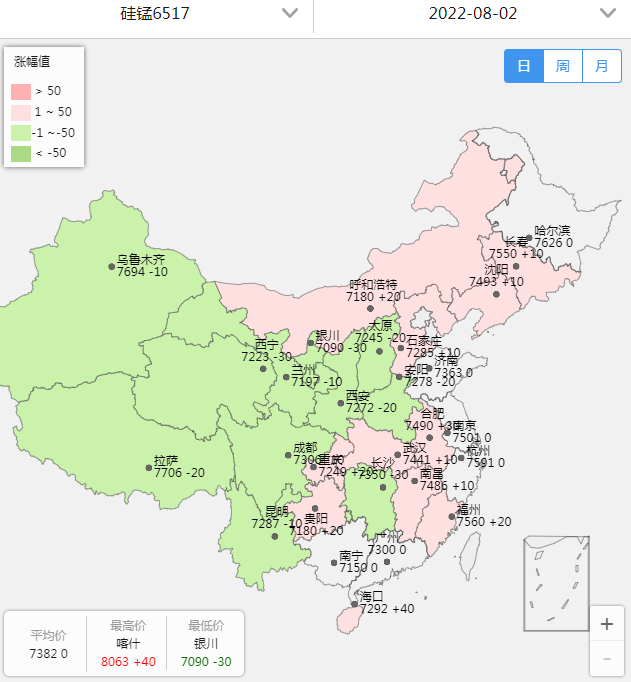 廣東某鋼廠8月硅錳合金采購價(jià)格敲定,為承兌含稅到廠7420元/噸;湖南某鋼廠8月硅錳合金招標(biāo)價(jià)格為承兌含稅到廠7480元/噸。