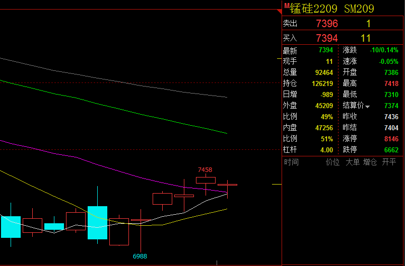 期貨市場(chǎng):今日硅錳期貨主力2209合約震蕩運(yùn)行,受黑色系夜盤震蕩的影響,今日早盤小幅低開,隨后圍繞日均線震蕩運(yùn)行至收盤。盤中zui高7418點(diǎn),zui低7310點(diǎn),當(dāng)日減倉989手,總持倉126219手,成交量較上一個(gè)交易日小幅減少,盤面錄得一根帶有一定下影線的小陽K線。今日盤面震蕩運(yùn)行,黑色系整體探底回升,短期來看,黑色系整體較強(qiáng),硅錳合金對(duì)黑色系走勢(shì)粘合性較高,但終端需求依舊并未出現(xiàn)明顯改善,區(qū)間運(yùn)行為主。操作建議:小倉位操作,并做好止盈止損。(僅供參考)